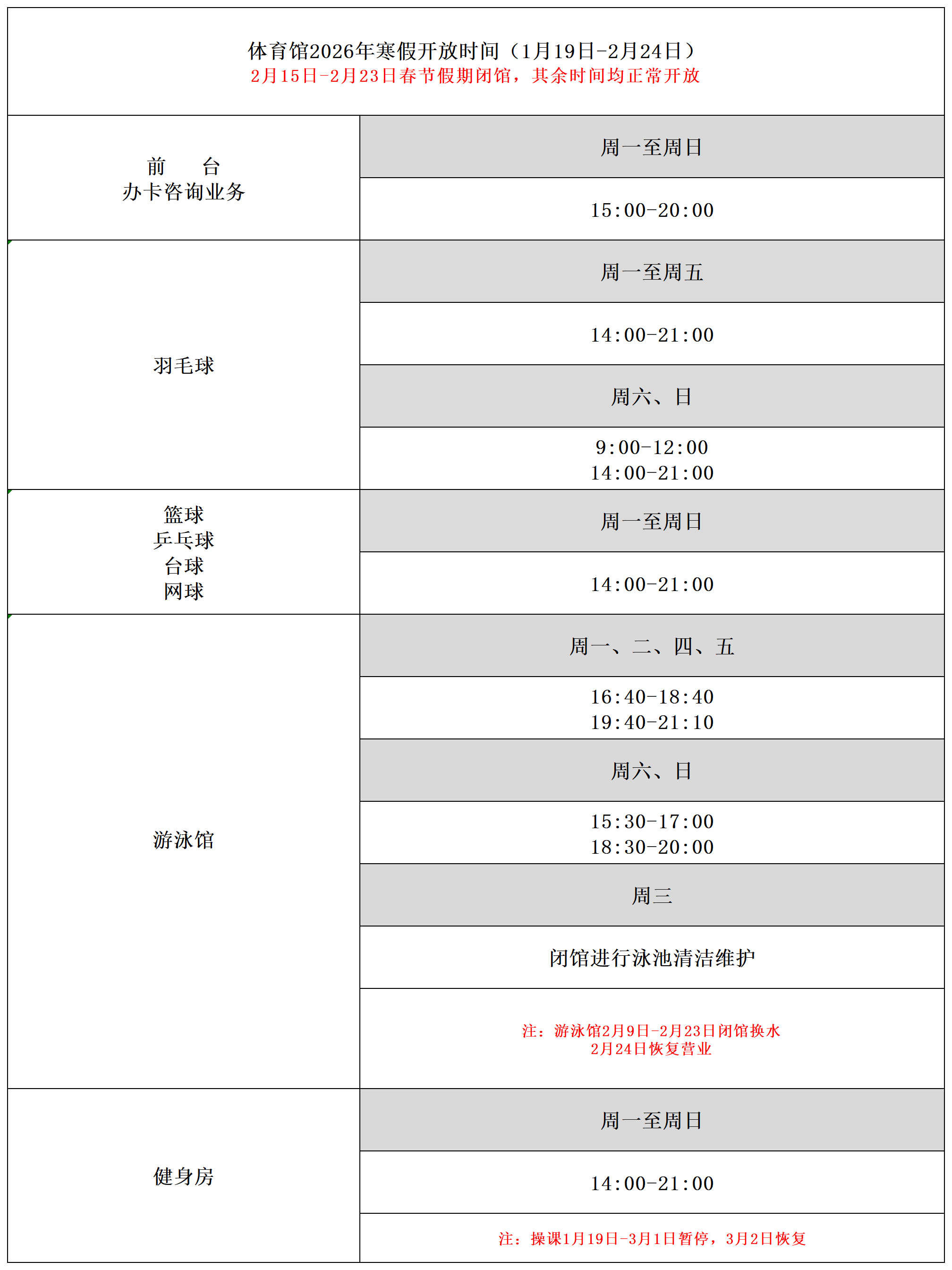 根据学校假期安排,为保障在校师生的体育锻炼需求,寒假期间(除春节假期外),体育馆均正常开放,具体开放时间调整如下: