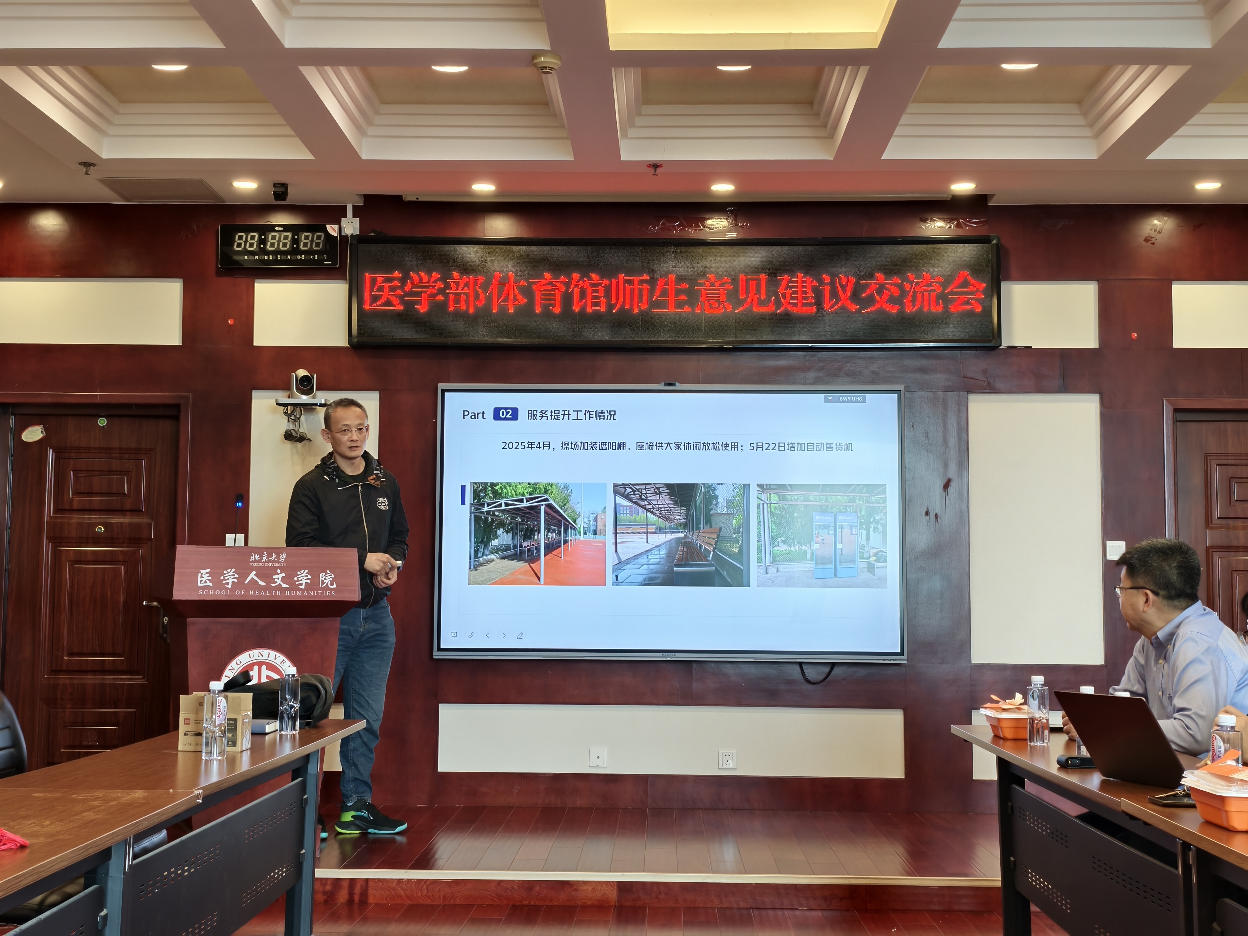 会议伊始,周彤馆长系统介绍了体育馆的运营模式、改进原则及近期改进成果。他提到:“作为自负盈亏的场馆,医学部体育馆始终在安全、服务与成本三者间寻求平衡。过去一年,我们通过升级场地环境、优化设施配置、拓展特色活动等举措,努力提升师生体验。”通过详实的图片案例展示,与会师生对体育馆的日常运营机制和阶段性改变有了更清晰的了解。